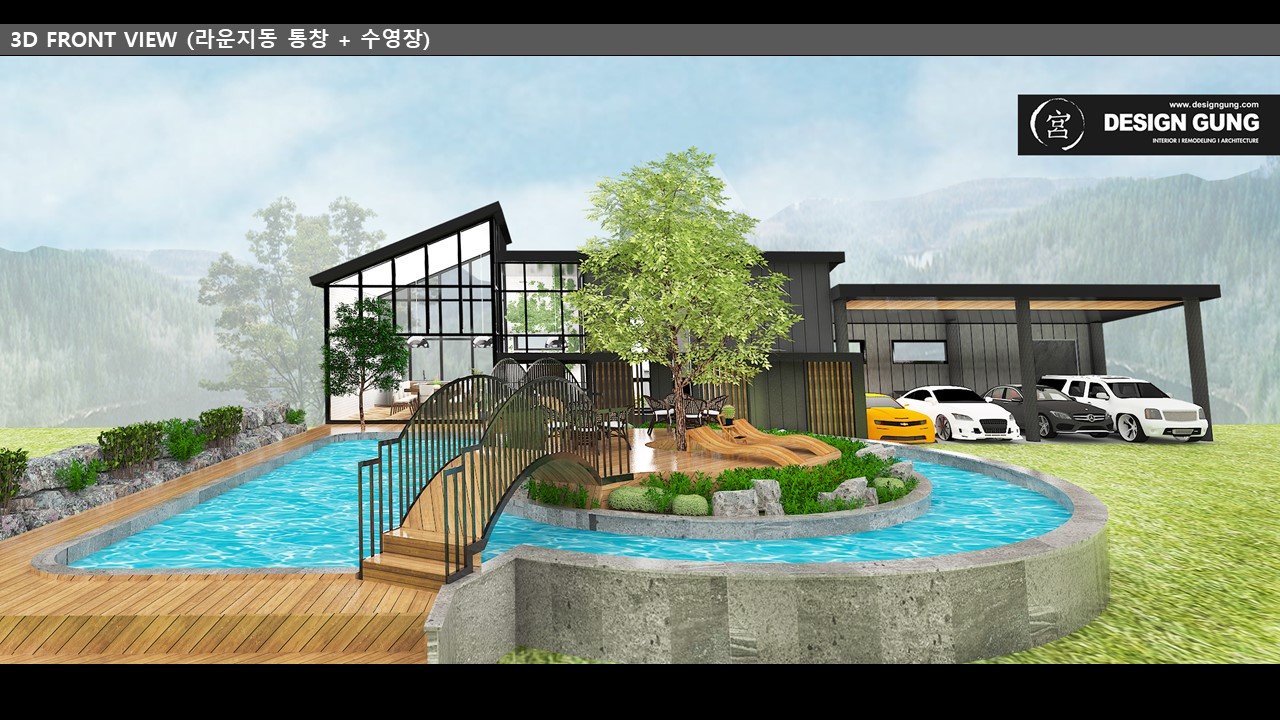 위의 라운지동은 넓은 공간을 확보한 상태로 신설하여 높은 자유도를 갖추게 되었습니다. 넓은 공간은 건축주분의 다양한 니즈를 최대한 반영할 수 있는 폭넓은 설계 여건을 만들어 주었고, 라운지동 신설 역시 이러한 자유도를 바탕으로 진행되었습니다. 주차 공간은 4대까지 수용 가능하며, 넓은 마당과 수영장은 방문하는 모든 손님을 편안하게 맞이할 수 있습니다. 미끄러질 우려가 줄어든 데크공간과 수영장의 조화는 마치 자연 속 별장에서 휴식을 즐기는 듯한 여유를 선사합니다. 라운지동과 연결된 실내 공간은 두 면을 모두 유리로 시공해 시각적인 개방감과 함께, 내부와 외부가 자연스럽게 이어지는 구조를 완성했습니다. 안에서는 밖을, 밖에서는 안을 자유롭게 바라볼 수 있어 답답함 없이 함께 어우러질 수 있는 공간입니다. 실내에는 조리와 식사가 가능한 넉넉한 주방과 다이닝 공간이 마련되어, 야외 활동 후에도 바로 편안하게 맛있는 식사를 즐길 수 있도록 배려했습니다. 또한, 안쪽에는 취미공간으로 작은 스크린 골프장으로 꾸며졌습니다. 이전까지 소개해드린 곳들이 한 번에 많은 사람이 어우러져 즐길 수 있는 공간이었다면 미니 골프장은 건축주분과 그 가족들이 소소하게 자신만의 취미를 즐길 수 있는 공간으로 남겨두었습니다. 별장 같은 이 공간은 디자인궁의 세심한 고민과 노력 끝에 완성되었으며, 건축주분은 물론 앞으로 이 공간을 마주할 여러분에게도 분명 멋진 경험이 될 것이라 자신합니다.